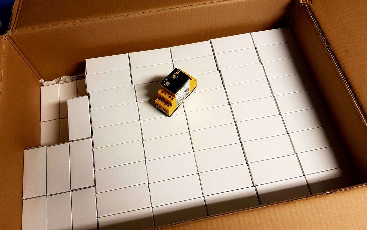 Vi har i 20 år levert høykvalitets multifunksjons tidsreleer fra sveitsiske Selectron AG til kunder i Skandinavia. Selv om markedet ikke vokser så er det fremdeles interesse for produktene. Bildet viser 100+ tidsreleer klare til forsendelse til kunde denne uka.