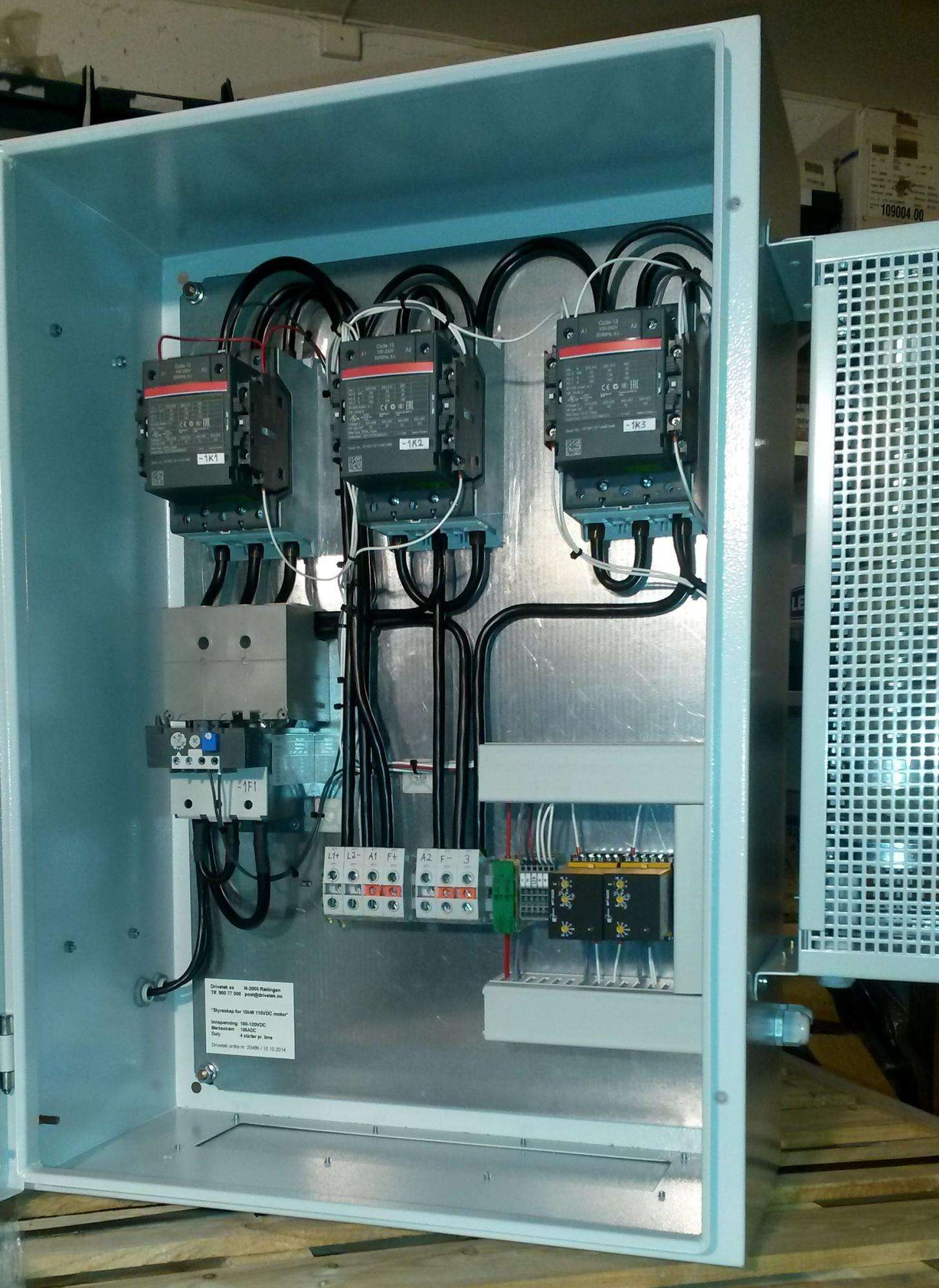Til en sentral aktør i energibransjen har vi designet og levert et komplett starterskap for en 100A batterimatet DC pumpemotor. Ankerstrømmen begrenses i 2 trinn ved hjelp av utvendig monterte effektmotstander.